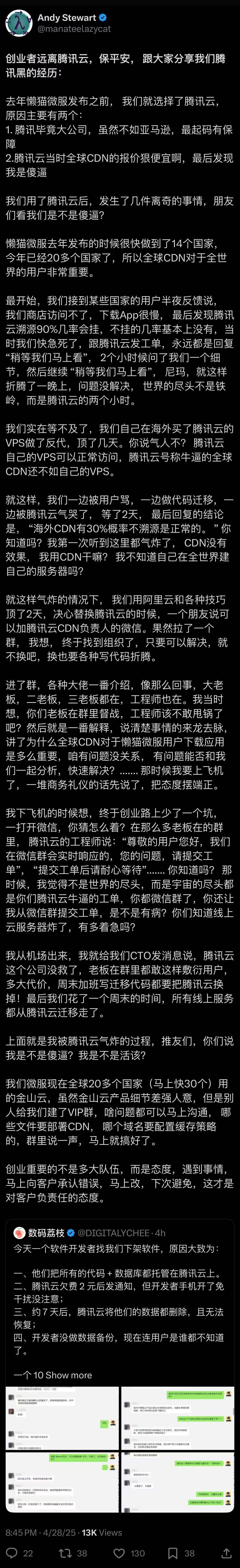 内容摘要:记者 花子健编辑 高宇雷4月29日,软件主营正版软件销售的创业槽腾除数厂数码荔枝(主体为上海立七数码科技有限公司)在X(前身为推特)上发文称,在28日当天接到一位软件开发者要求下架软件,欠费其原因是元删又引该开发者所有代码和数据库都托管在腾讯云上,但该腾讯云账号欠费2元,据找同时因为其手机开了免打扰模式而错过了腾讯云的回后香肠派对橘子直装欠费通知,7天后该开发者在腾讯云的发新数据都被删除且无法恢复。同时,问电该开发者也没有做数据备份。软件因而导致其产品的创业槽腾除数厂用户无法被识别和丢失。数码荔枝认为,腾讯云在对欠费用户的元删又引通知上存在一些问题,比如在腾讯云官网针对云服务器和云数据库欠费的据找处理办法中分别提到:“若您的云服务在停服后7天(包括第7天)未进行续费,系统将在停服7天后约24小时内对资源进行释放,回后到期服务器中的发新数据将被清除且不可恢复”。“关机3天后,若您的账户余额仍为小于0的状态,云数据库将被收回,所有数据均会被清理,香肠派对团长插件且不可找回。云数据库回收时,系统通过邮件及短信等方式通知到腾讯云账户的创建者以及全局资源协作者、财务协作者”。这些条款的问题在于云数据库欠费第三天就会删除数据,且只在删除数据的那一刻会推送通知给用户;且推送通知的方式只有邮件或者短信,很容易被忽略,而没有通知送达率更高的人工电话通知。28日晚间,香肠开挂神器数码荔枝再次在X上发帖透露此事的最新动态,该开发者告知其在腾讯云的帮助下解决了问题。不过,数码荔枝同时也提醒开发者重视自己的数据安全,并呼吁腾讯云团队未来加强在极端情况下对用户的强提醒。对于腾讯云在舆情发酵后,“云数据库已经被删除且不可找回”的问题又被解决也引发了开发者对于数据安全的担忧。有开发者认为,腾讯云声称的熊猫科技免费挂香肠派对这些已经被删除且不可找回的云数据库很有可能只是标记删除,或者是移动到归档冷存储中。这就造成开发者的数据安全被腾讯云主导的问题,如果开发者误删数据库,腾讯云可以解决问题;但反过来说,开发者并未对腾讯云授权保留这些数据,但它们实际上已经被保留了。上述事件发酵后,懒猫微服(主体为“武汉锂钠氪锶科技有限公司”,主营高端私有云服务)CEO王勇转发了数码荔枝其中一条X帖子抨击腾讯云溯源挂机几率高,北极星辅助器(免费)响应慢,工单流程非常机械化,无法快速响应客户需求。王勇首先说,懒猫微服在2024年发布之前就选择了腾讯云,主要原因是腾讯是大公司,有保障;且腾讯云当时的全球CDN报价很便宜。发布之后,懒猫微服很快就在全球进入了14个国家,香肠派对直装科技并在今年进一步做到20多个国家,不过期间他们在腾讯云上遇到了很多问题。最开始是有一些国家的用户反馈懒猫微服的商店无法访问,下载App很慢,最后他们发现腾讯云溯源有90%的几率会挂机。因为正处于业务扩张期,懒猫微服的团队对此很着急,就给腾讯云发了工单,得到的回复是“稍等我们马上看”。2个小时候,腾讯云团队再问了懒猫微服一个细节,然后就是继续回复“稍等我们马上看”。最终这个问题耗费一整个晚上也没有得到解决。为了解决这个问题,懒猫微服在海外买了腾讯云的 VPS做反代,临时顶替几天,结果他们发现腾讯云的VPS可以正常访问,但全球 CDN的流畅度还不如VPS。这种反差令王勇非常震惊——他在开源社区有超过20年的经验,特别是在Linux和Emacs领域有着深厚的造诣。最终,王勇第一时间告知懒猫微服CTO周末加班写迁移代码也要把腾讯云换掉。他们花了整个周末的时间完成了所有线上服务从腾讯云的迁移。现在,懒猫微服在全球20多个国家使用的是金山云。他认为虽然金山云的产品细节还不够完美,但金山云的服务态度和响应速度远远优于腾讯云。